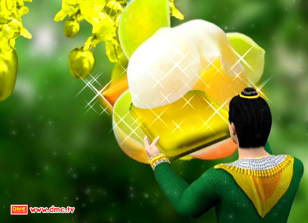 มานพหนุ่มจึงได้เหยียดมือออกไป ดอกกัลปพฤกษ์ขนาดใหญ่ก็ค่อยๆบานออกแล้วโน้มช่อดอกลงมา ที่กลางดอกนั้นมีผ้าทิพย์